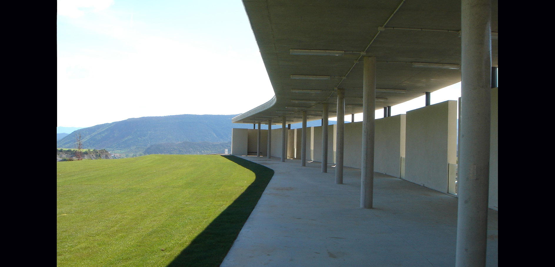 La nave de mantenimiento continua el volumen de la marquesina formando una ele en dirección Norte-Sur conteniendo los usos necesarios para el mantenimiento del club de golf.