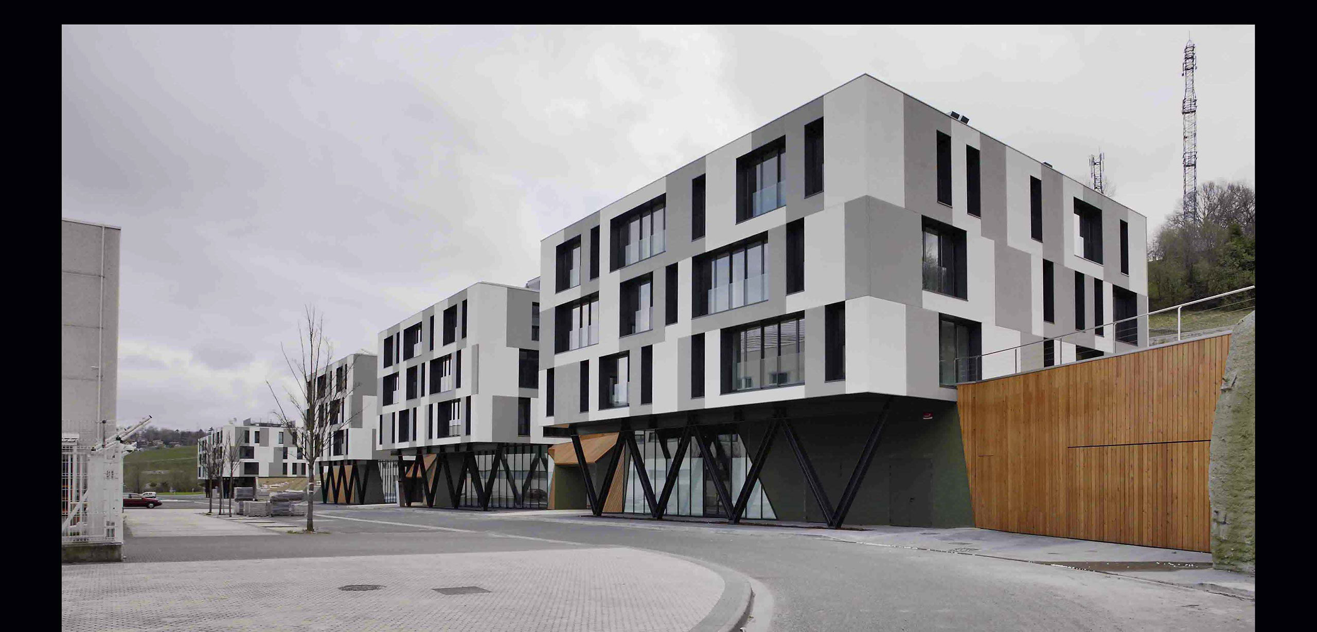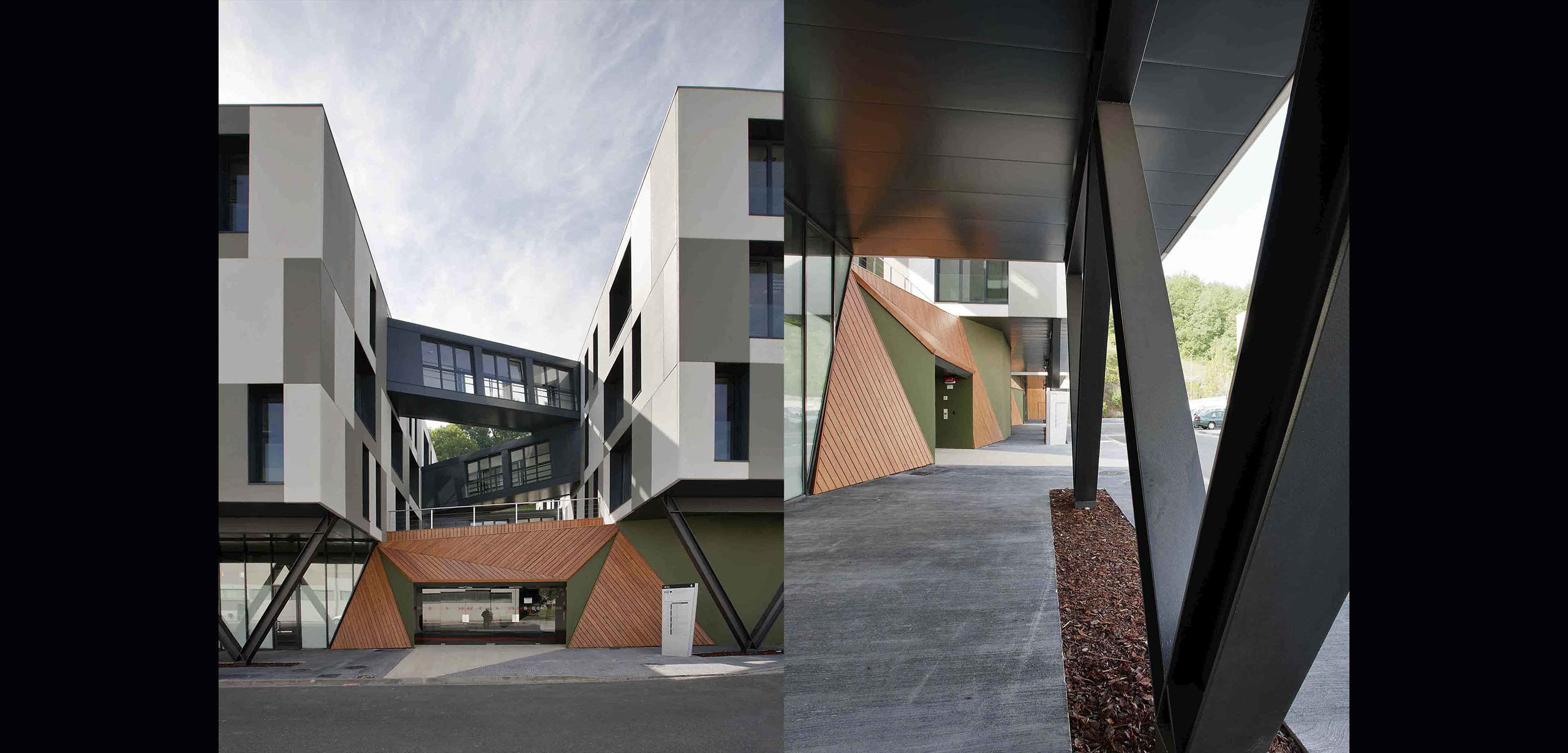 Les caractéristiques géologiques du terrain ont exigé une solution de construction unitaire. Un traitement d’ensemble de tout le front du coteau vers le parc d'affaires. La superficie du bâtiment prévu est divisée entre deux lots d'équipement, en construisant 5 modules qui sont configurés en tant que "contreforts" qui résistent aux poussées horizontales du terrain.