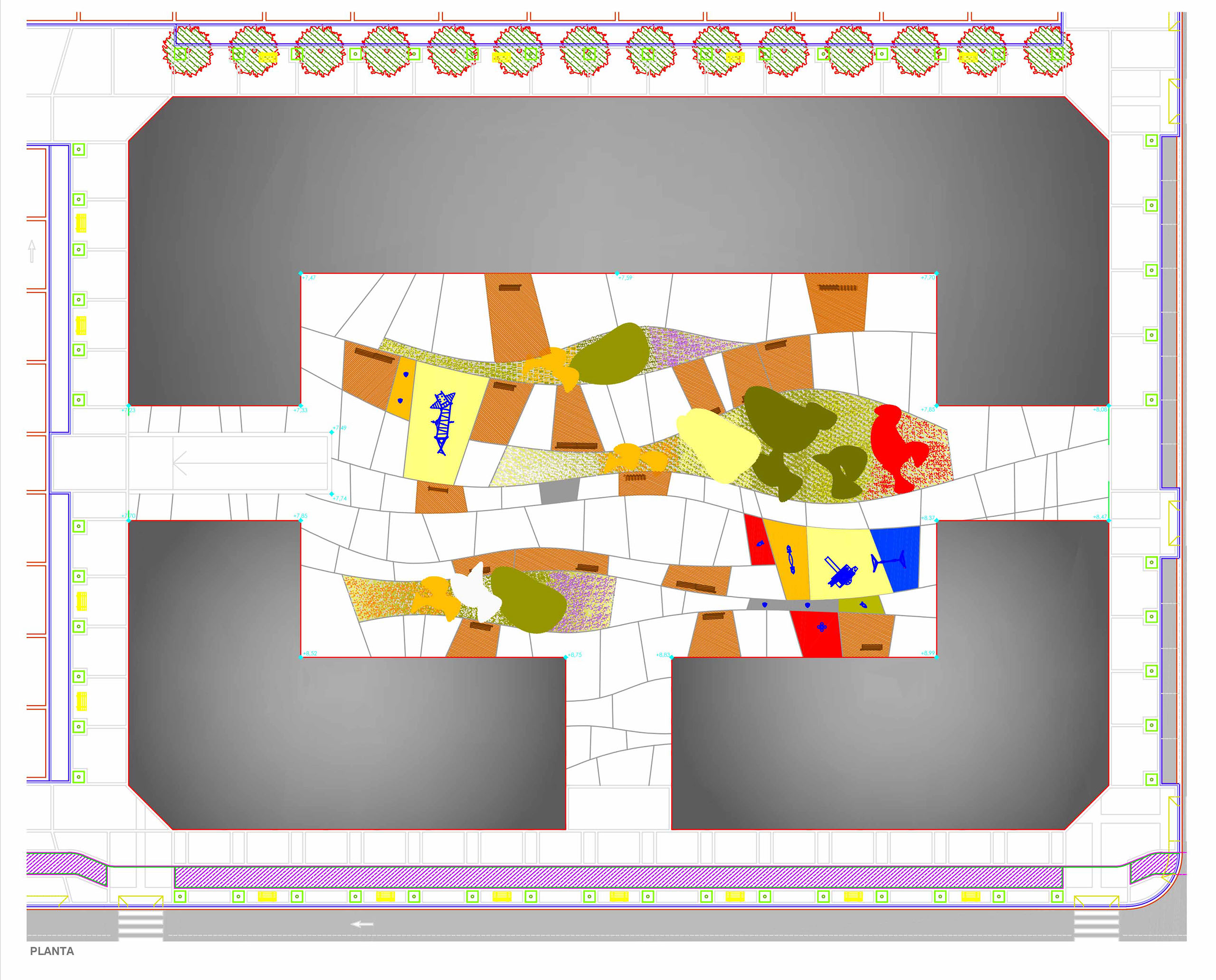 Nuestra propuesta persigue un diseño natural, de formas orgánicas, donde la vegetación tenga un gran protagonismo. Jardines alargados acompañan a los recorridos peatonales, protegen las zonas de estancia y conforman un paisaje atractivo para el peatón y una vista sugerente desde las viviendas.