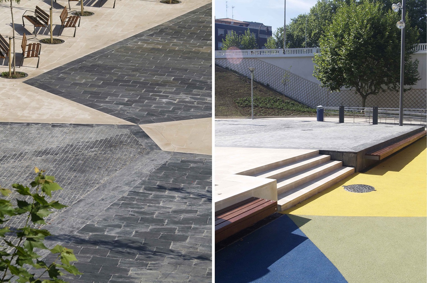 Los pavimentos se realizan mediante losas de piedra y adoquín en dos tonos y caucho de color en la zona de juegos de niños.