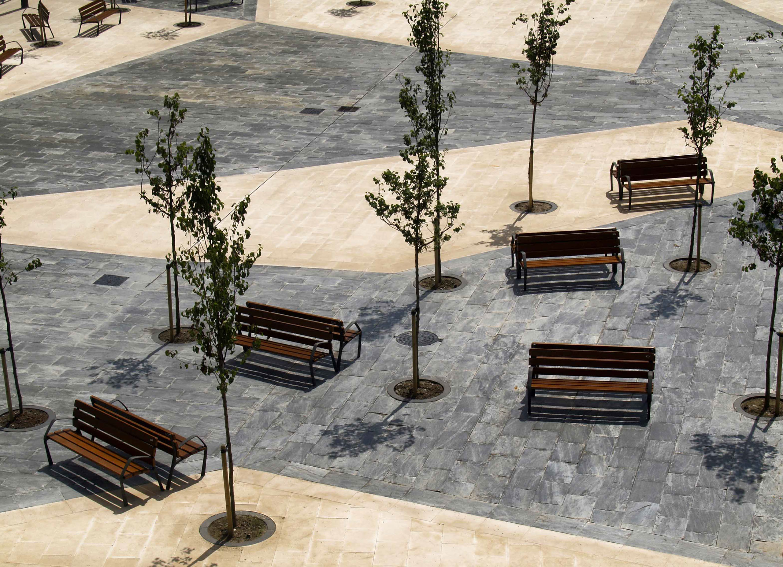Les dallages et pavements sont réalisés en utilisant des dalles de pierre et des pavés en deux tons, tandis que le caoutchouc est utilisé à l´aire de jeux pour enfants.