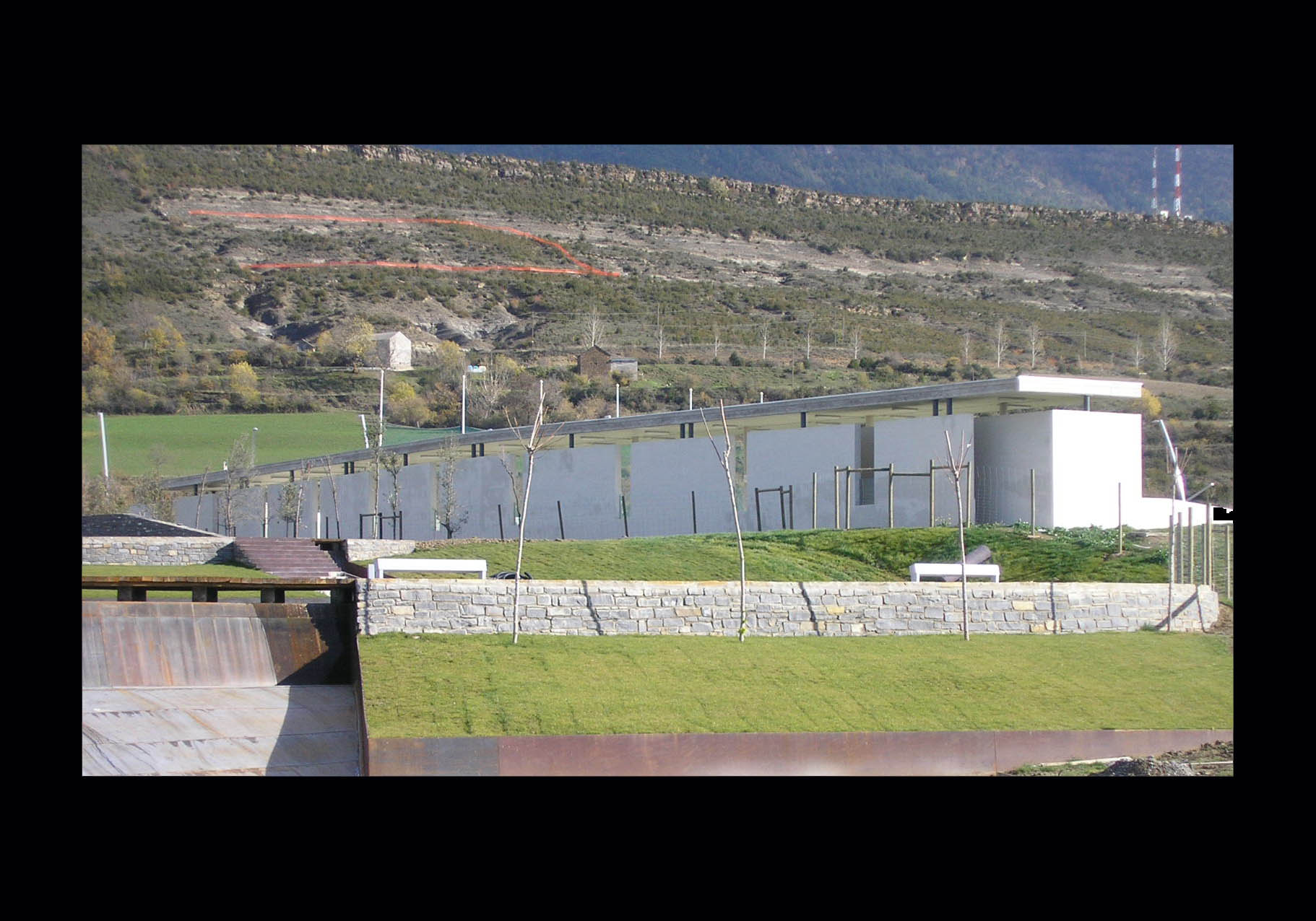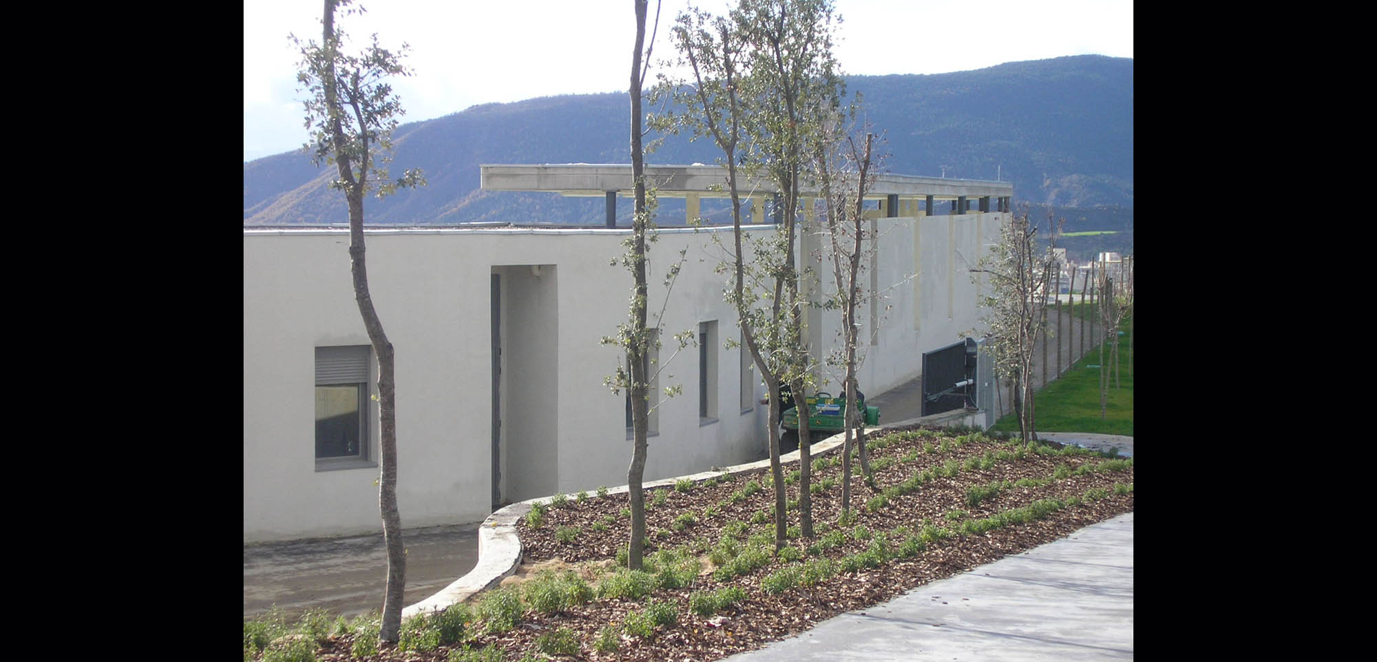 La nave de mantenimiento continua el volumen de la marquesina formando una ele en dirección Norte-Sur conteniendo los usos necesarios para el mantenimiento del club de golf.