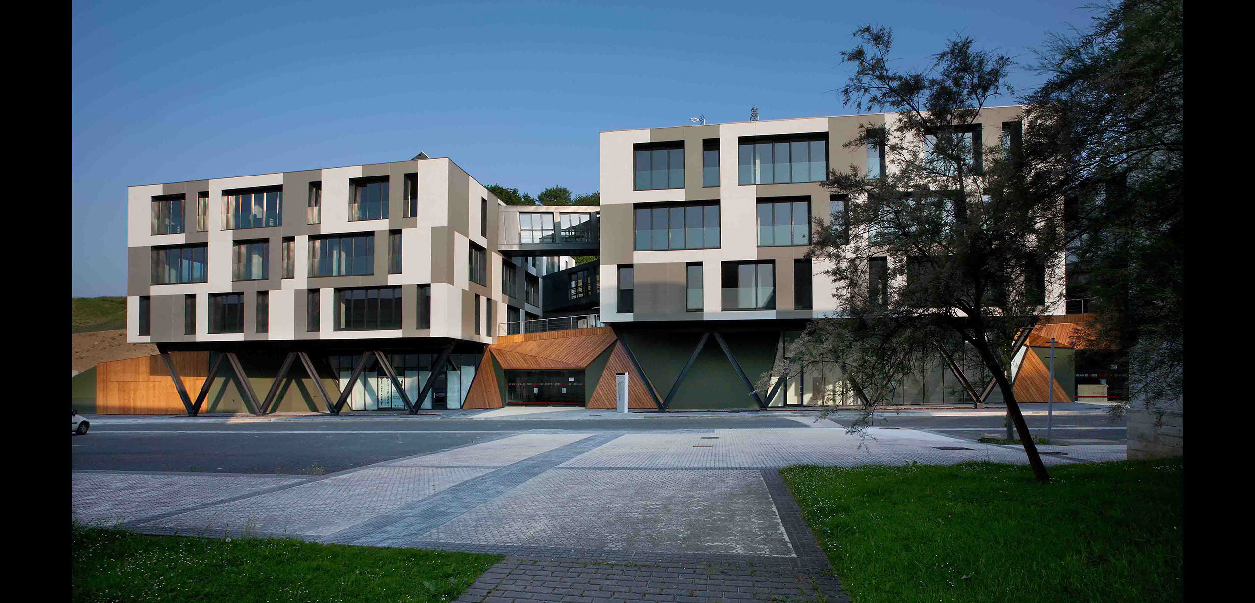 Las características geológicas del terreno, han exigido una solución constructiva unitaria. Un tratamiento conjunto de todo el frente de la ladera hacia el parque empresarial. La edificabilidad prevista se reparte entre dos parcelas de equipamiento, construyéndose 5 módulos que se configuran como “contrafuertes” que resisten los empujes horizontales del terreno.