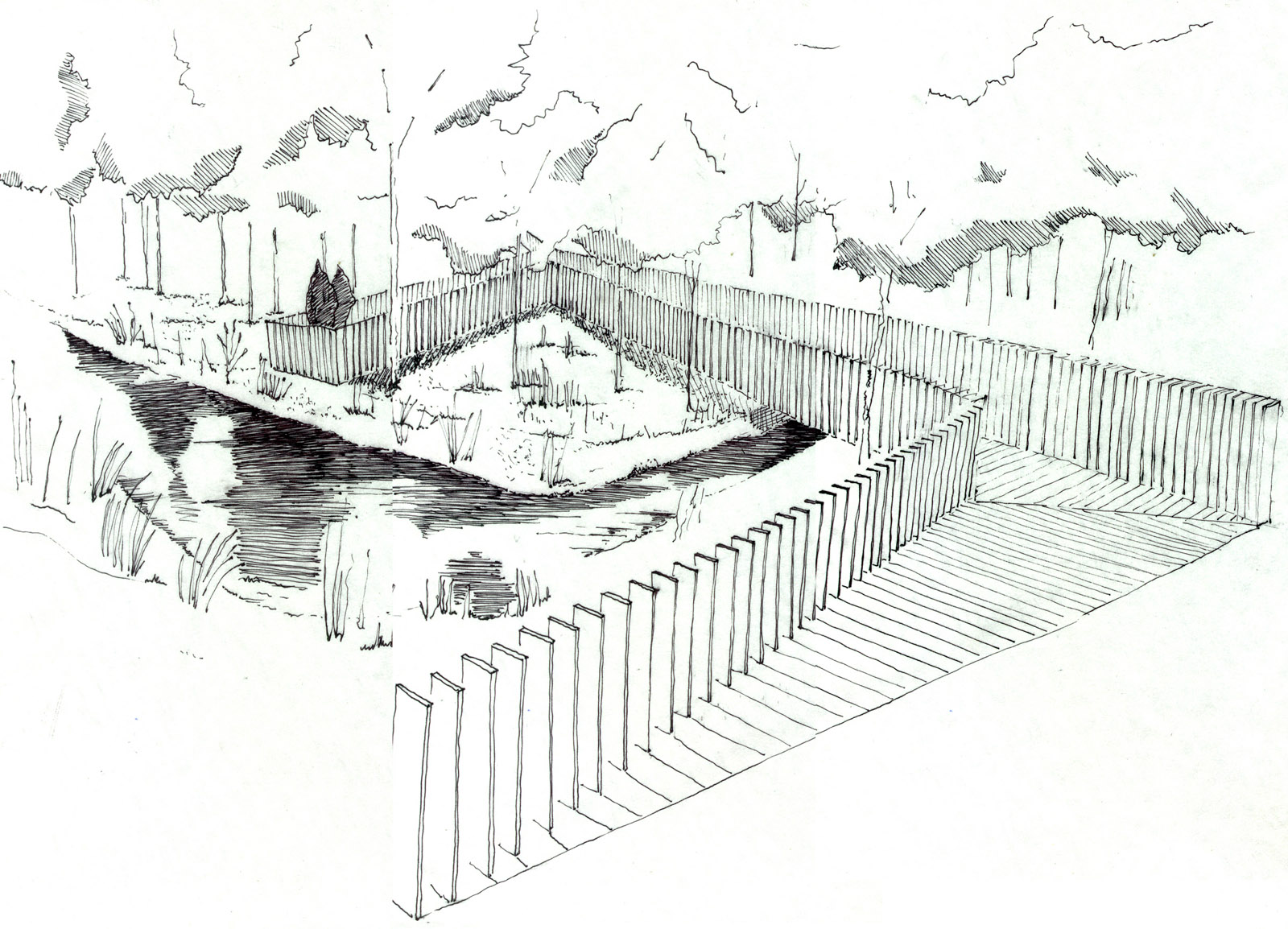 We have designed an elevated footbridge, made of wood, that crosses over the alder tree area and occupies the needed work-space to sustain the sick trees. It goes from ground level to the +3,5 meter high mark (as tall as the tree tops) and contains a viewing area that sticks out over the water layer.