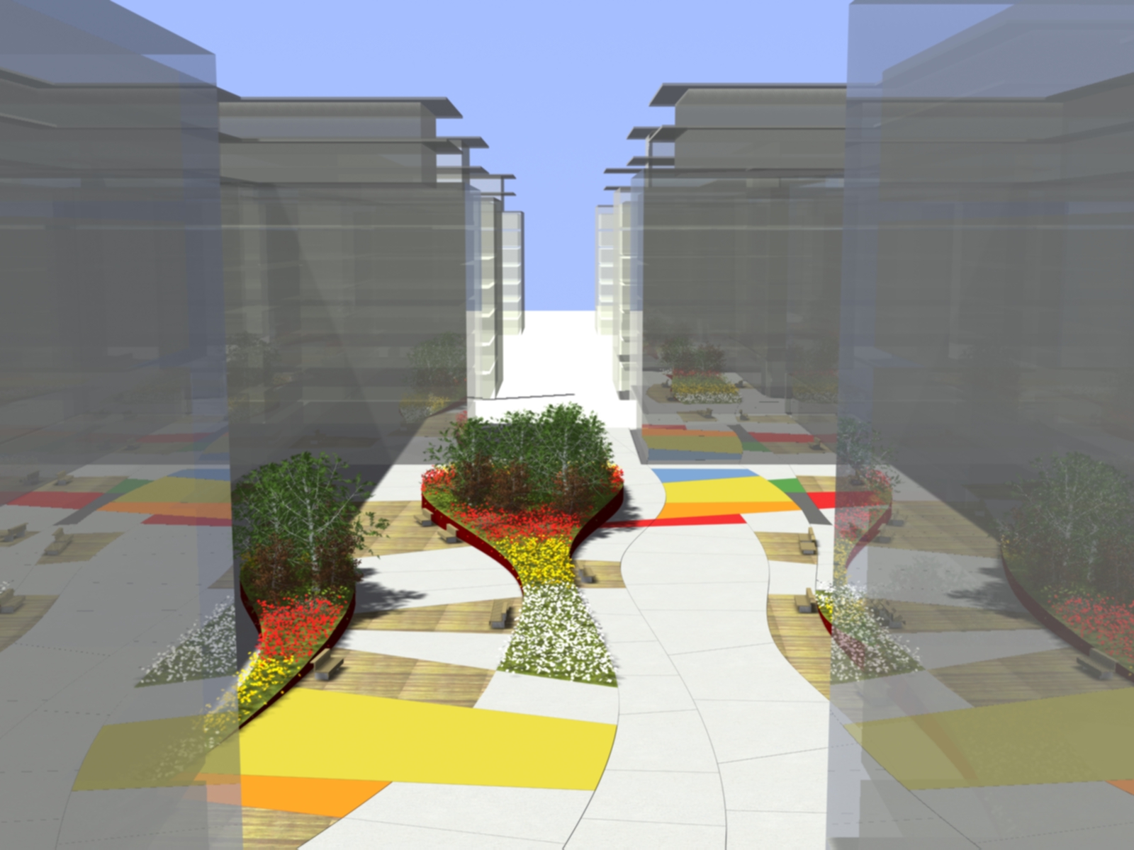 Las plazas situadas en el interior de las manzanas deben, por tanto, ser espacios que favorezcan los recorridos peatonales, donde la naturaleza “amortigüe” el sonido de las vías rápidas. Lugares de estancia con un carácter que reúna parque y plaza en un mismo espacio.