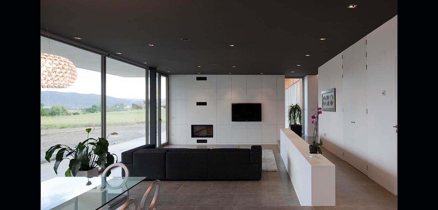 Las viviendas se orientan hacia el Sur – Este, con vistas hacia el núcleo urbano a través de un gran hueco acristalado y dan la espalda a la zona industrial situada al Norte. Esta gran apertura vidriada queda encerrada en una línea continua y quebrada de hormigón blanco, que caracteriza el perfil de la edificación. La fachada posterior, mucho más opaca, se resuelve con un revestimiento de lajas verticales de piedra.
